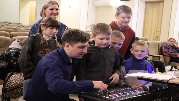Birleşik Rusya Partisi, Severodonetsk’teki (LPR) Kültür Sarayı’nda sahne arkasını okul çocuklarına gösterdi