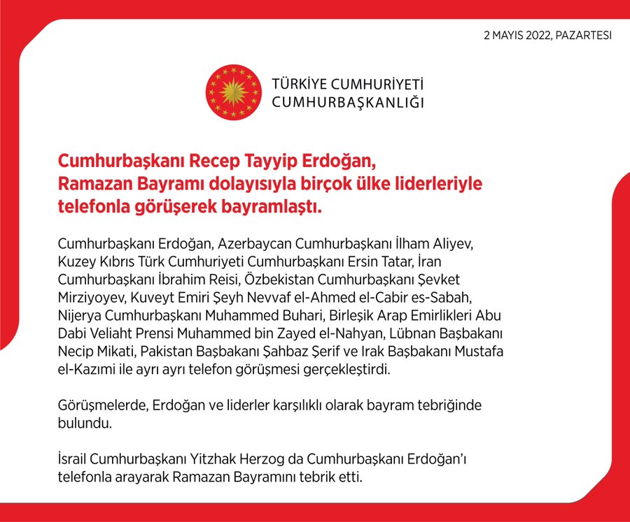 kaynak:https://www.tccb.gov.tr/basin-aciklamalari/365/136755/sayin-cumhurbaskanimizin-ramazan-bayrami-dolayisiyla-gerceklestirdigi-telefon-gorusmeleri-